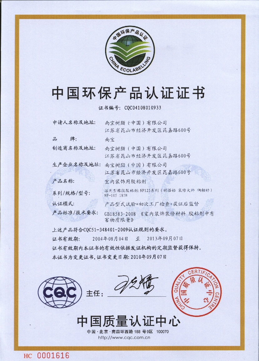 中国环保产品认证证书(胶粘剂)